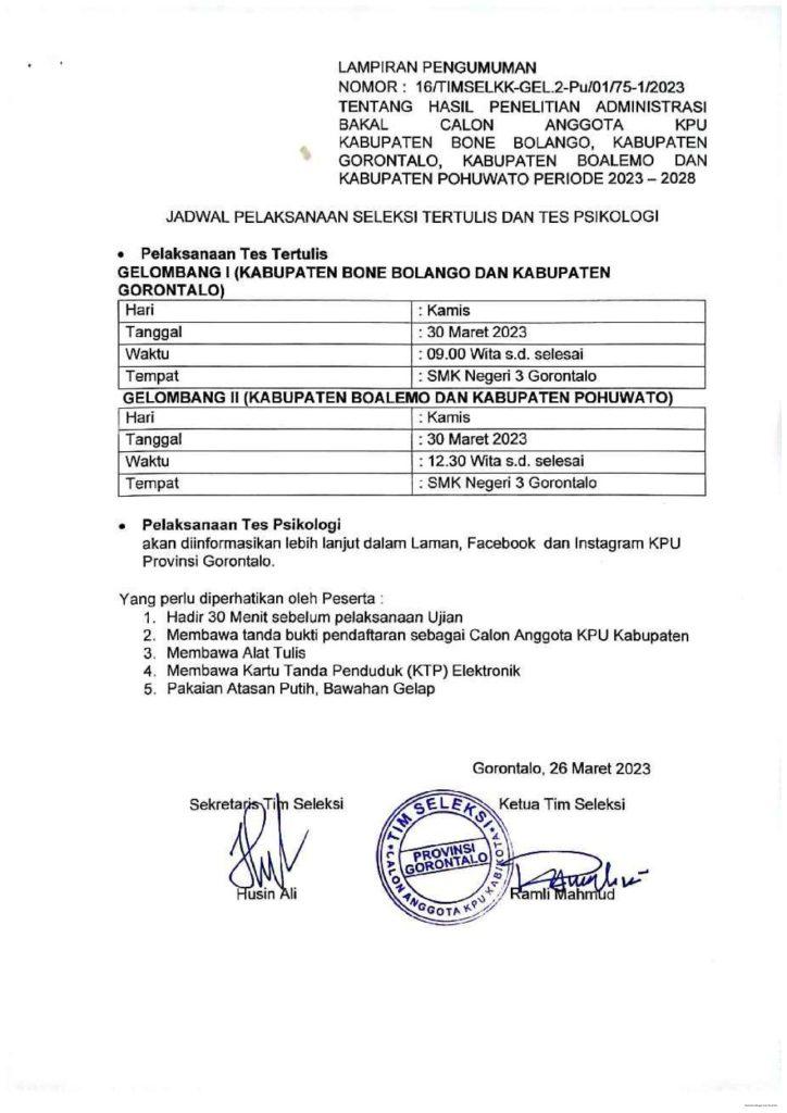 HESTEK, GORONTALO – Hasil penelitan administrasi, Bakal Calon Anggota Komisi Pemilihan Umum (KPU) Bone Bolango, Kabupaten Gorontalo, Boalemo dan Pohuwato periode 2023-2028, secara resmi telah diumumkan.