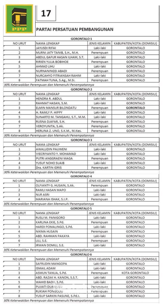 HESTEK.CO.ID – Komisi Pemilihan Umum (KPU) Kabupaten Gorontalo telah menetapkan daftar calon tetap (DCT) anggota DPRD Kabupaten Gorontalo dari Partai Persatuan Pembangunan (PPP).