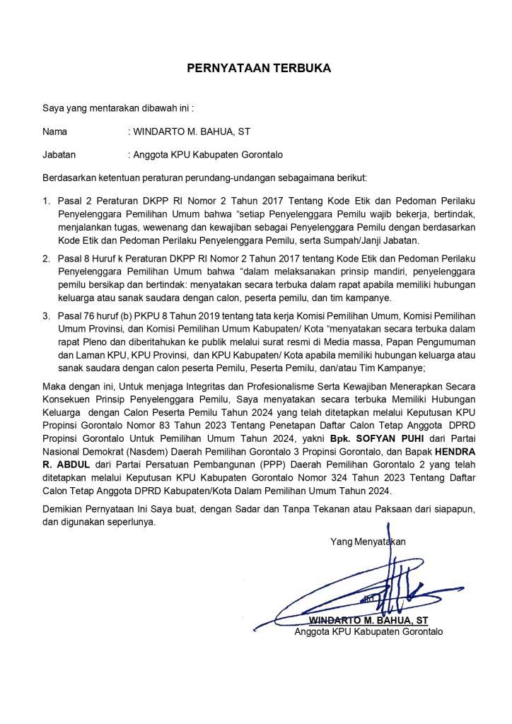Berikut surat pernyataan terbuka dia Anggota KPU Kabupaten Gorontalo Sowan S Dehi dan Windatro M. Bahuwa :