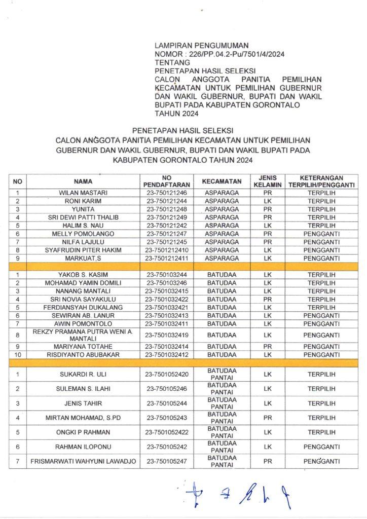 Berdasarkan pengumuman KPU Nomor : 226/PP.04.2-Pu/7501/4/2024 Tentang Hasil Penetapan Seleksi Calon Anggota PPK terpilih, untuk Pemilihan Gubernur dan Wakil Gubernur, Bupati dan Wakil Bupati Gorontalo Tahun 2024.