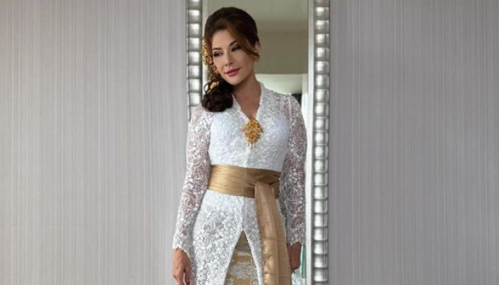 Tamara Bleszynski yang hadir dalam proses lamaran tampil mengenakan kebaya putih dipadu nuansa emas. Rambutnya mengenakan aksesori keemasan yang serupa dengan bros di dada. Lalu ada kain dalam warna senada melingkar di pinggangnya.