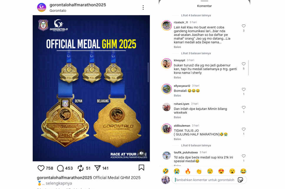 “Lain kali kalau mau buat event coba gandeng komunikasi lari… kasihan so banyak orang jauh yang mau datang, lia kamari medali ada Depe nama,” tulis salah satu warganet yang menyoroti keberadaan nama individu dalam medali lomba.