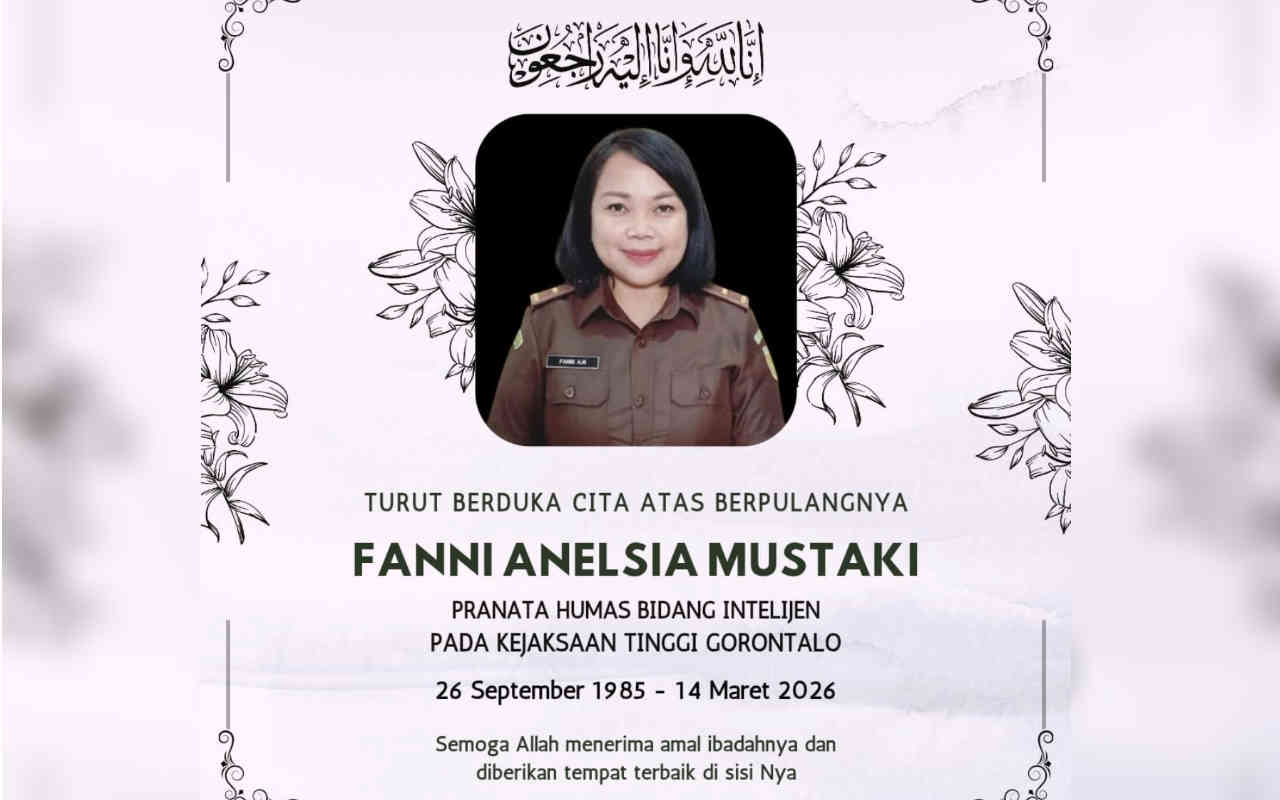 HESTEK.CO.ID – Kabar duka datang dari lingkungan Kejaksaan Tinggi Gorontalo. Salah satu sosok yang dikenal dekat dengan kalangan jurnalis, Fanni Anelsia Mustaki, meninggal dunia pada Sabtu, 14 Maret 2026.