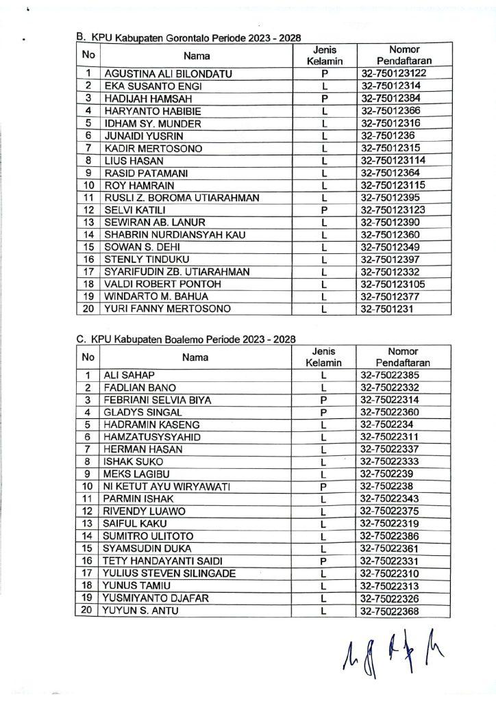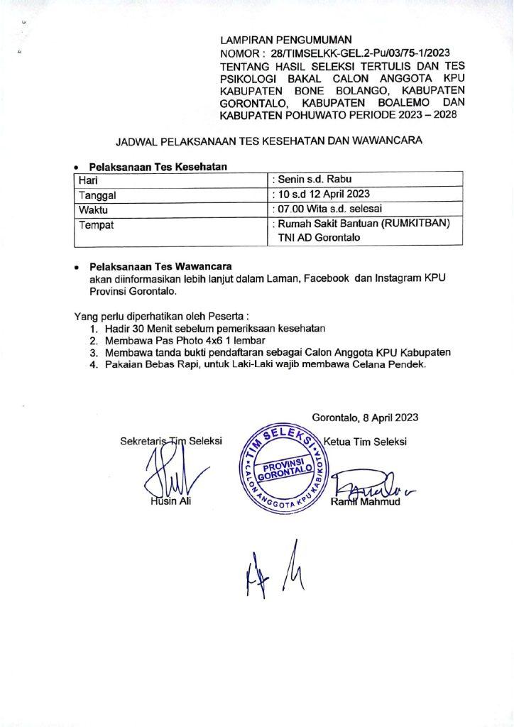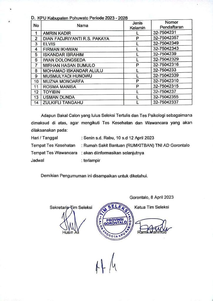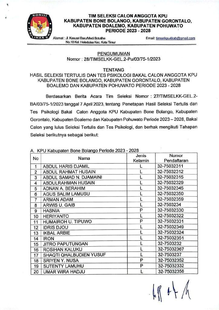 HESTEK, GORONTALO – Tim Seleksi (Timsel) Komisi Pemilihan Umum (KPU) secara resmi mengumumkan hasil seleksi tertulis dan psikologi Bakal Calon Anggota KPU Kabupaten Gorontalo, Bone Bolango, Boalemo dan Pohuwato, Selasa (7/4/2023).